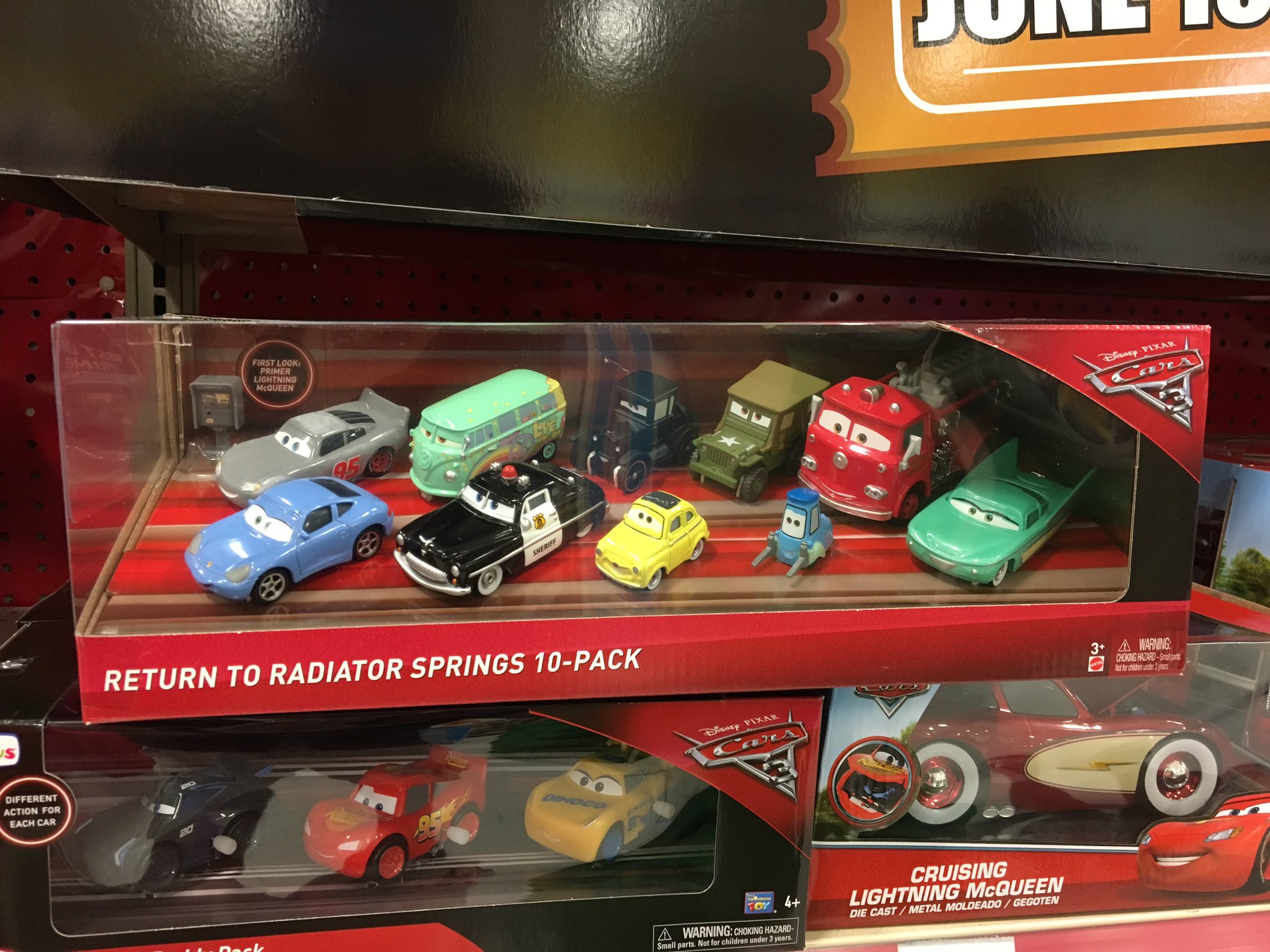 There are five other (six total) single cars in this little sub-series (like McQueen here, they all come with a brand new/unique bumper sticker): Blowing Bubbles Mater (with hay bail), Sally with Tattoo (with dinner table), Ramone (with oil can), Doc Hudson (with Piston Cup trophy) and Sheriff (no accessory). You can see them all HERE. There's also a Sarge (with traffic cone) available in THIS "Welcome to Radiator Springs" 4-Pack. Again, all of these are available at Target right now, so be sure to get them while you can!